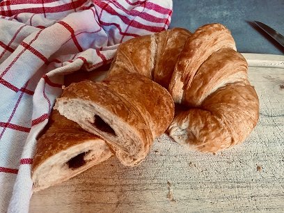 Bio Nougat CroissantsWeizenfreiZutaten: 50% Dinkelvollkornmehl*50% Dinkelmehl Type630*Milch*Butter*Eier*Zucker*Gerstenmalz*HefeMeersalz*Füllung: Rapunzel Samba Haselnuss-Schoko Creme** kba (kontrolliert biologischer Anbau)