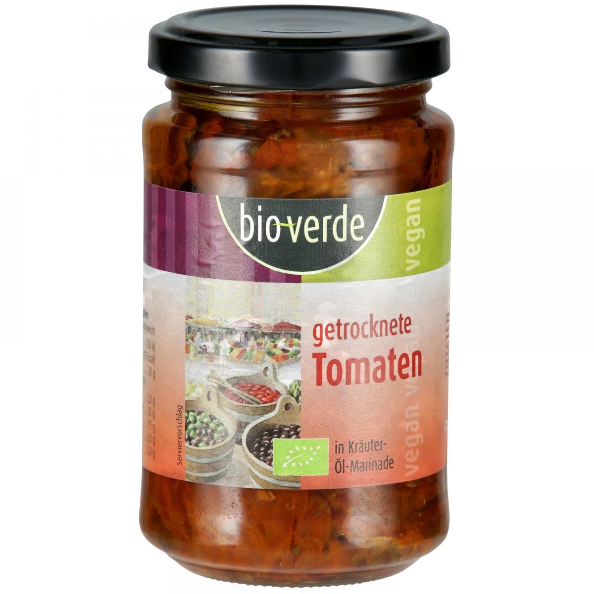 Die Tomaten werden bei bio-verde mit hochwertigem Öl und frischen Kräutern mariniert und veredelt. Die 200g-Gläser zur Selbstbedienung sind im Trockensortiment zu finden.