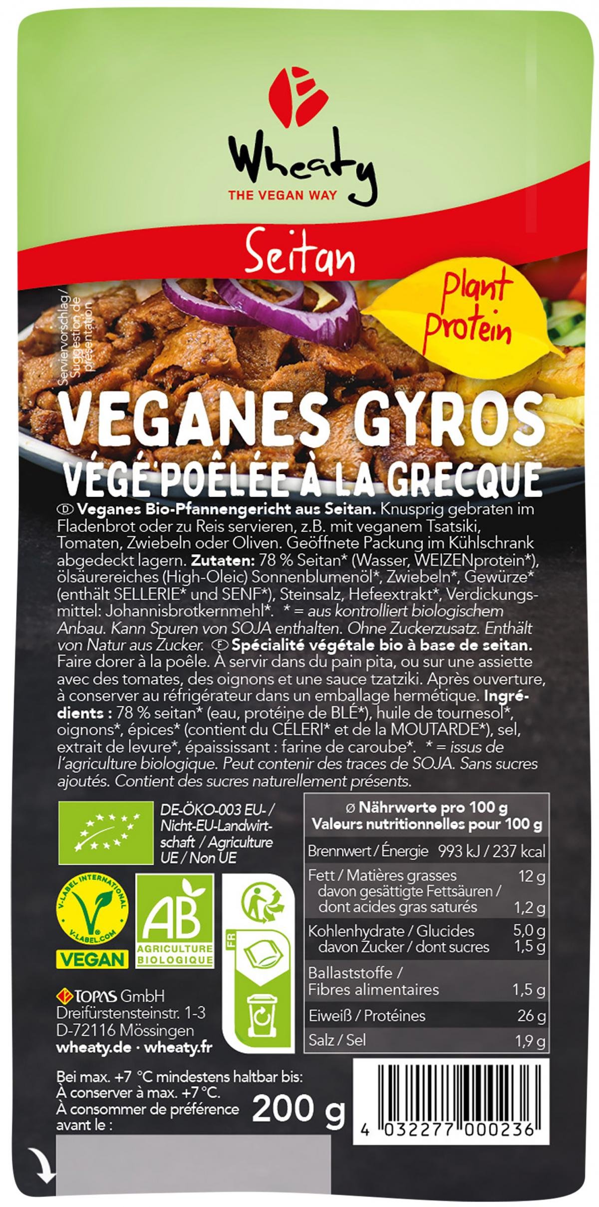 78 % Seitan* (Wasser, WEIZENprotein*), ölsäurereiches (High-Oleic) Sonnenblumenöl*, Zwiebeln*, Gewürze* (enthält SELLERIE* und SENF*), Steinsalz, Hefeextrakt*, Verdickungsmittel: Johannisbrotkernmehl*.